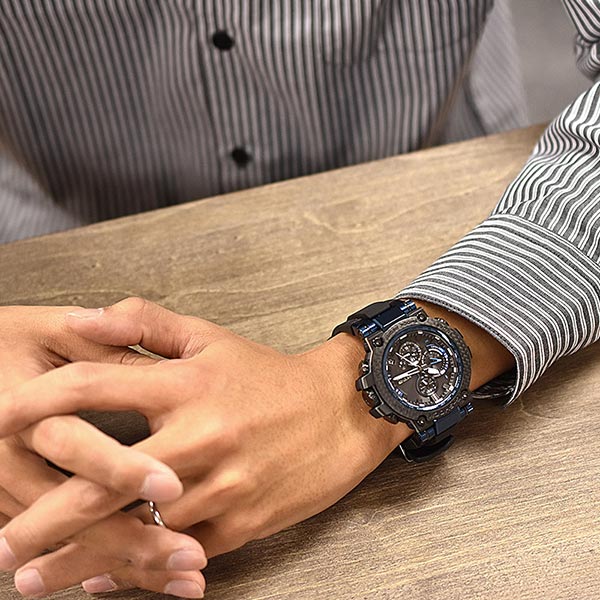 カーボンベゼルカーボン特有の炭素繊維の柄が特徴タフソーラー電波定期的な電池交換・時刻修正が不要ワールドタイム表示機能2都市の時刻を同時に確認できるクールなカラーリングメタリックブルーがアクセントに穴留め式サイズ調整の必要がないケースバックトリプルGレジストの刻印高級感のあるフォルム重厚感がありながらも112gと軽量LEDライト搭載暗所でも優れた視認性
