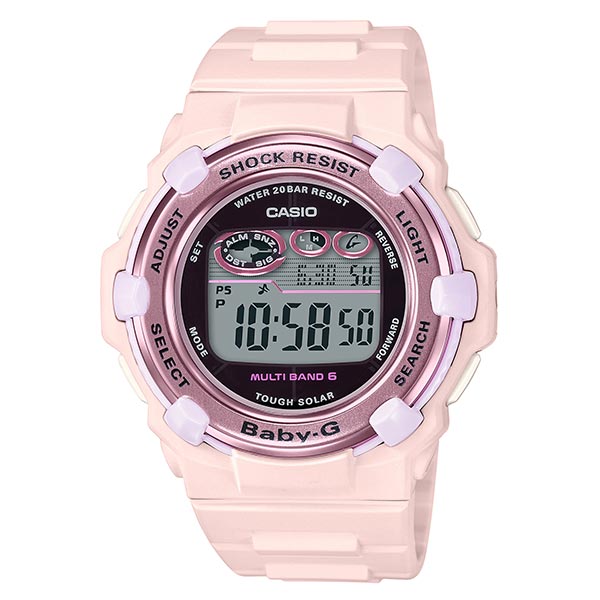 ベビーGアクティブ&カジュアルカジュアルなデザインバックライト付きのデジタル文字盤タフソーラー電波時計定期的な電池交換・時刻修正が不要20気圧防水日常生活で安心な防水設計豊富な機能カレンダーやワールドタイム等を搭載穴留め式サイズ調整の必要がないケースバックブランドロゴを刻印